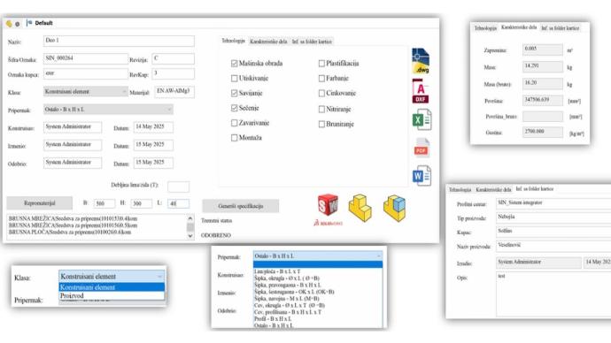 Ove stavke smo uveli u PDM kao virtuelne dokumente, povezane sa konstruisanim delovima. Sistem sada omogućava izbor materijala direktno u PDM-u, uz precizno definisan utrošak. Kada se generiše sastavnica proizvoda, sve informacije o sirovinama automatski se prenose u ERP – sa tačnim količinama, čime se izbegava manuelni unos i smanjuje mogućnost greške u nabavci.