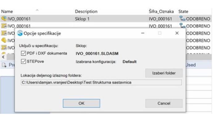 Slika: Eksport strukturne sastavnice u Excel fajl za dalji uvoz u ERP