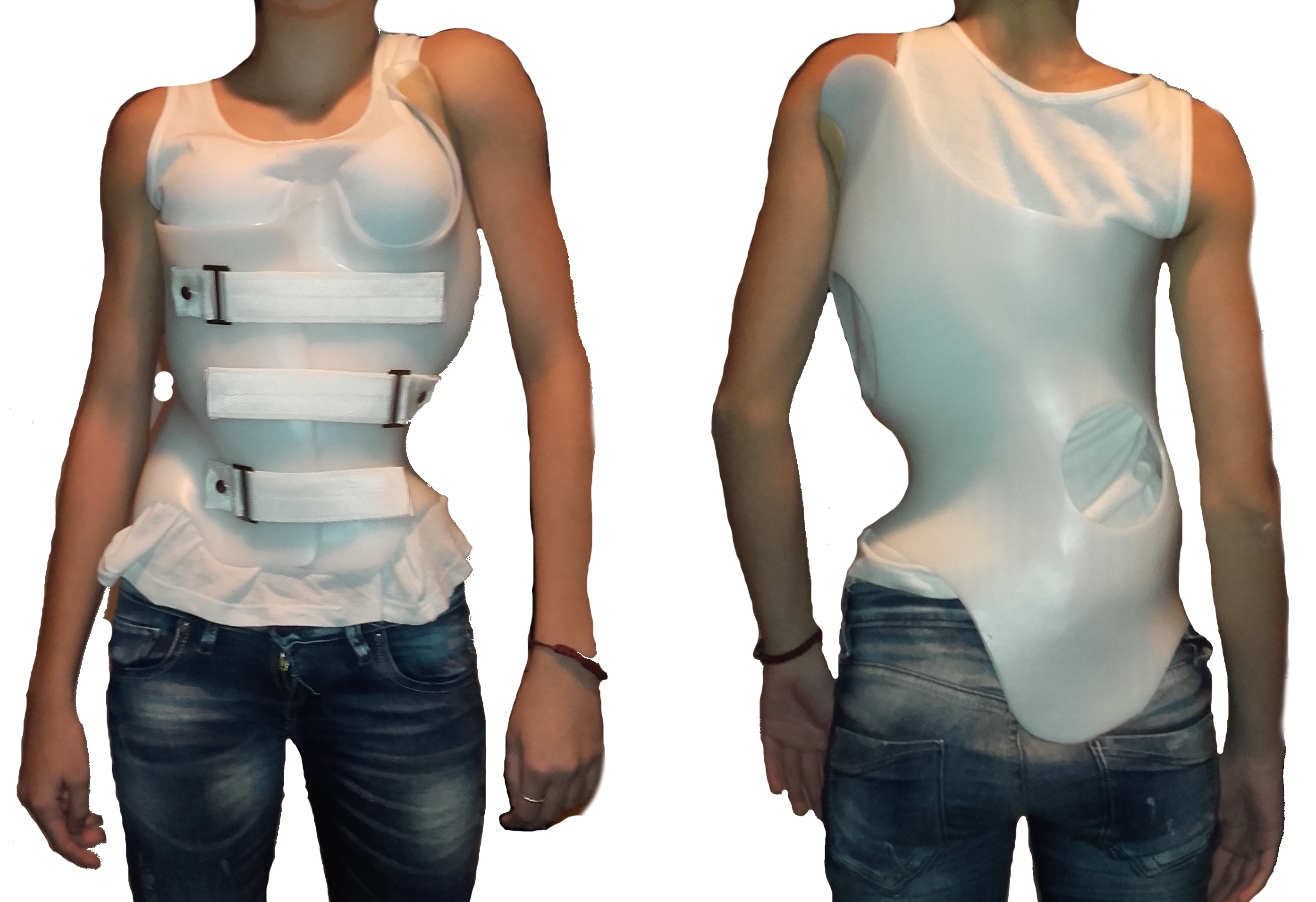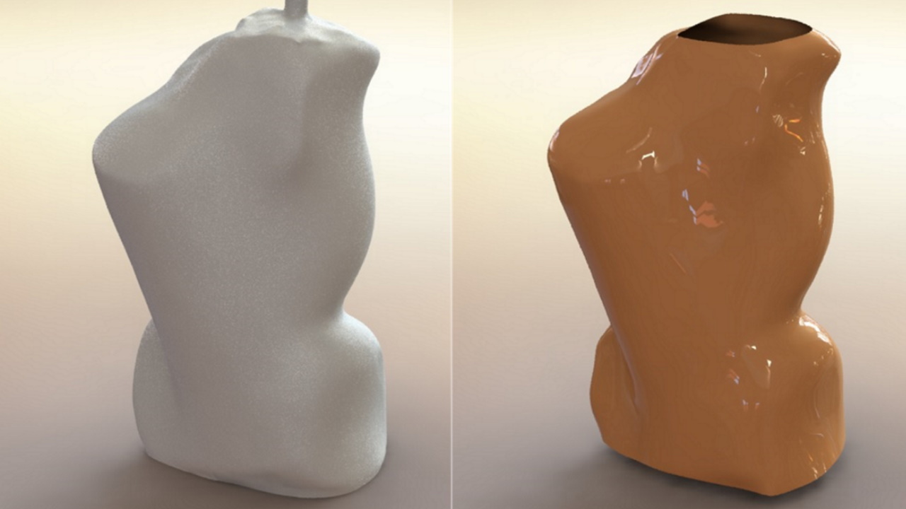 Solfins je kreirao parametarski model (sasvim levo) koji se edituje prema merenjima torza svakog novog pacijenta i generiše kompletnu površinu (sredina levo), zatim se oduzimaju delovi površine da se dobije željeni oblik midera (sredina desno), i na kraju se dobija konačni izgled midera (sasvim desno).