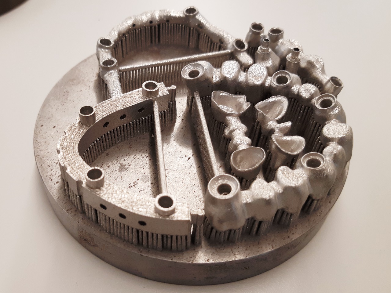 Kod 3D štampača u dentalnoj industriji potrebno je pronaći optimalni tip i jačinu lasera kako bi se obezbedio najbolji kvalitet. Manja snaga i manja brzina daju finije delove, ali se moze izgubiti gustina, dok laseri veće snage prave probleme sa preciznošću komada i završim površinama. Na slici iznad je radna platforma većih 3D štampača 3D Systems-a (200x200mm).