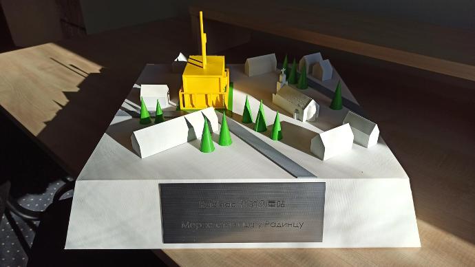 Sama merna stanica je malih dimenzija u odnosu na standardne objekte što je pravilo problem - trebalo je prikazati da stoji u urbanom okruženju obližnjeg mesta (kuće, crkva), ali je trebalo prikazati i radnu stanicu sa prepoznatljivim detaljima. Zato je očigledno uvećana i razdvojena bojom od ostatka makete kako bi prikazala sve što je potrebno.