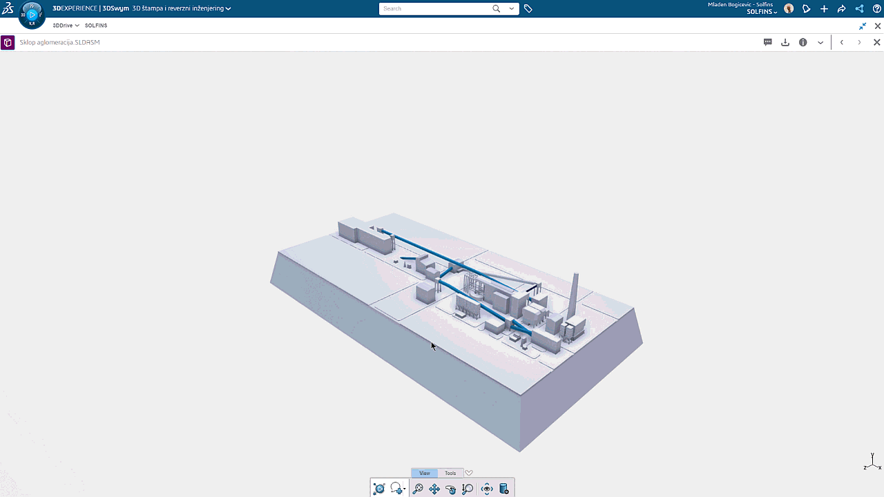 Izvorni SolidWorks 3D model uploadovan i editovan direktno na 3DEXPERIENCE platformi u prikazu kako su ga mogli videti svi koji su imali bezbedan link - kako interno kod nas u Solfinsu, tako i osobe zadužene za projekat kod klijenta. Ovo je bilo ključni kako bi se brzo i jednostavno iskomuniciralo sve pre puštanja na 3D štampu i sklapanja.