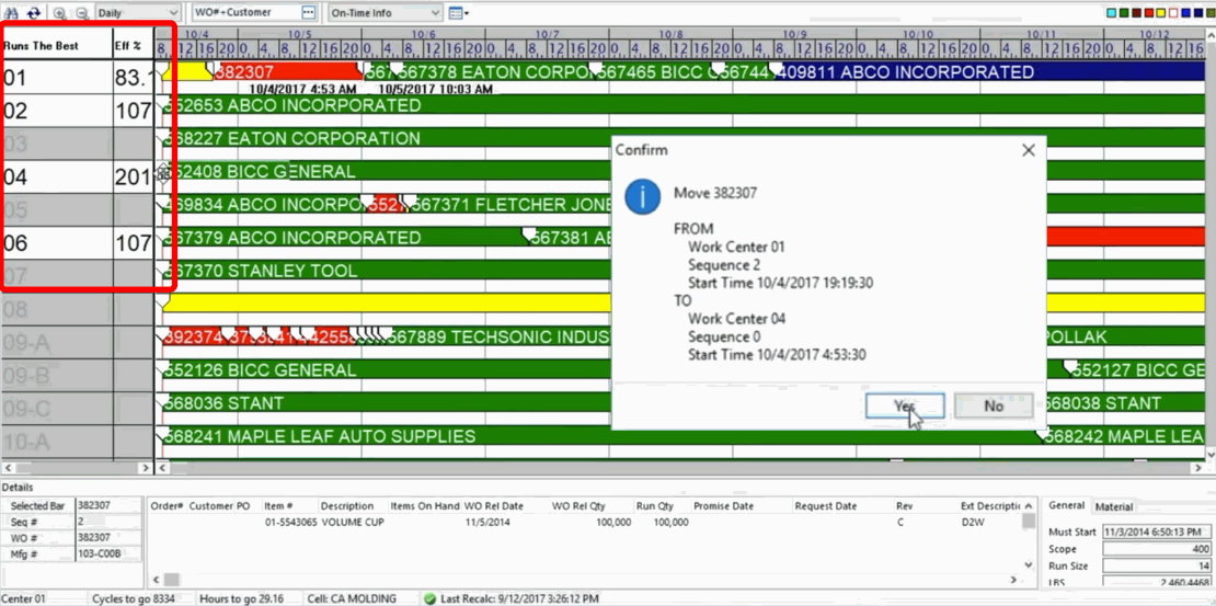 U GVS (Graphic View Schedule) prikazu planer vidi vremensku osu i sve radne naloge poređane po radnim centrima, sa jasnim vizuelnim oznakama kašnjenja i statusa. Funkcija Snap to Last Job automatski „prilepi“ novi nalog odmah posle prethodnog, dok Just‑in‑Time (JIT) opcija koristi Must Start datum umanjen za Safety Lead Time da predloži optimalan datum starta. Auto Load funkcija može automatski da „isprazni“ raspored izvan definisanog Time Fence‑a i da ponovo rasporedi sve otvorene naloge na osnovu Runs the Best liste, primarnog alata, prioriteta i datuma Must Start, uz mogućnost backward passa kako bi se smanjila kašnjenja.Scheduling.pdf