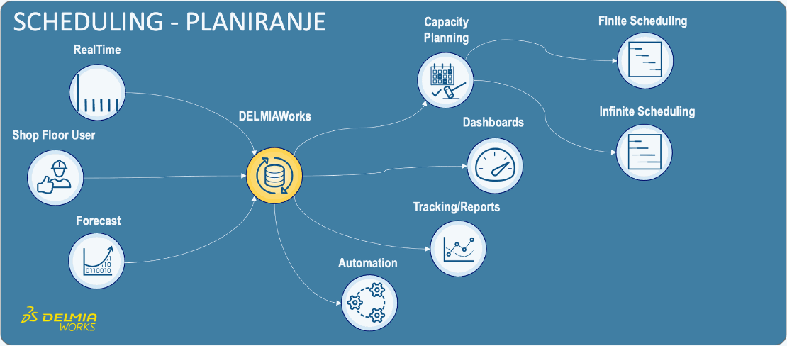 Planiranje i terminiranje proizvodnje (Planning & Scheduling modul) u DELMIAWorks‑u je centralno mesto za kratkoročno planiranje proizvodnje, finite scheduling (konačni resursi) po mašinama i radnim centrima, kao i za kapacitete mašina, materijala i radne snage. Kroz jedan integrisan ekran planer dobija realan raspored radnih naloga, upozorenja na kašnjenja, preopterećenja i materijalne manjkove, sa direktnom vezom ka MRP/MPS analizama i RealTime podacima iz proizvodnje.