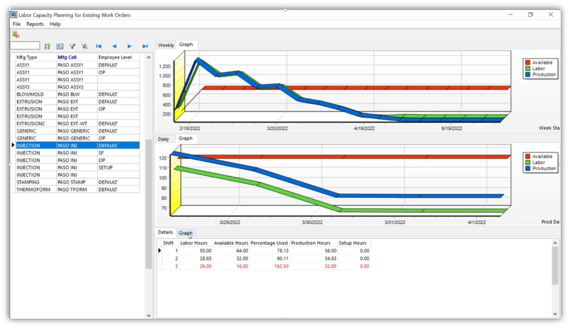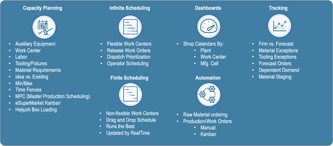 Za srednjoročno kapacitetsko planiranje koristi se Rough Cut Capacity i Capacity Whiteboard, koji pokazuju odnos zahtevani vs. raspoloživi sati po tipovima mašina, ćelijama i radnim centrima. Rough Cut Capacity koristi Shop Calendar da izračuna raspoložive sate i prikazuje grafički po nedeljama/danima koliko je kapacitet iskorišćen (zelena – dostupno, žuta – blizu granice, crvena – preopterećeno), uključujući i prošle duge (Past Due). Capacity Whiteboard dodatno omogućava „whiteboard“ pregled kapaciteta sa bar grafovima i procentima iskorišćenja po periodima, tako da planer vrlo brzo vidi gde treba prerasporediti ili dodati smenu.Scheduling.pdf