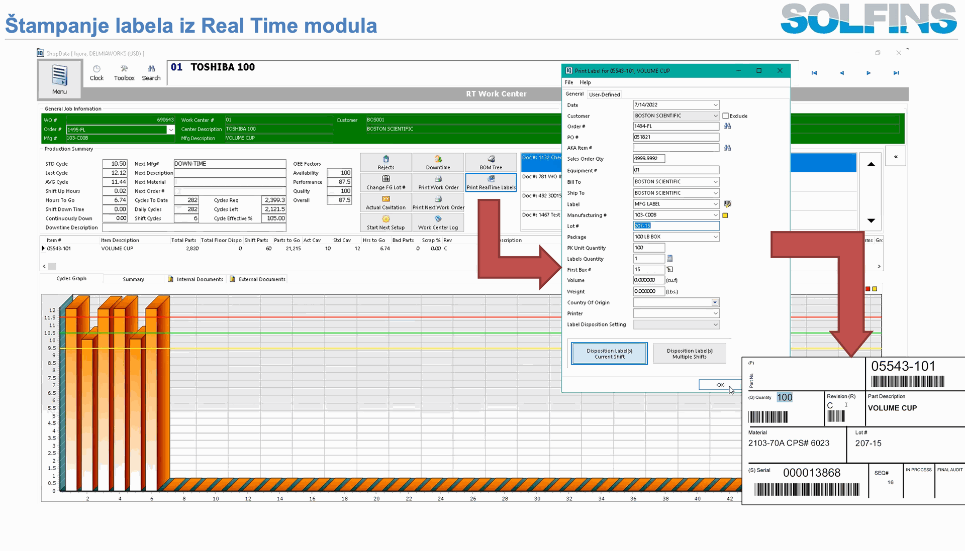 Osnova za kontrolu proizvodnje je veza između BOM‑a, radnog naloga i RealTime podataka: za svaki nalog znamo šta treba da se proizvede, na kojoj mašini, kojim tempom i u kojoj smeni, a RealTime ciklusi i ShopData transakcije pretvaraju to u stvarno proizvedene količine i sate rada. RTServer automatski „broji“ cikluse sa mašina, računa dobre delove i prepoznaje zastoje, dok ShopData na touchscreen terminalima omogućava da operater prijavi proizvodnju, škart, zastoje, kretanje serija i paleta – sve to u okviru istog radnog naloga. U praksi to znači da se na kraju smene ili serije ne sabiraju papiri, već se iz sistema otvara i zatvara proizvodni izveštaj koji već sadrži sve cikluse, dobre komade, škart i sate rada.