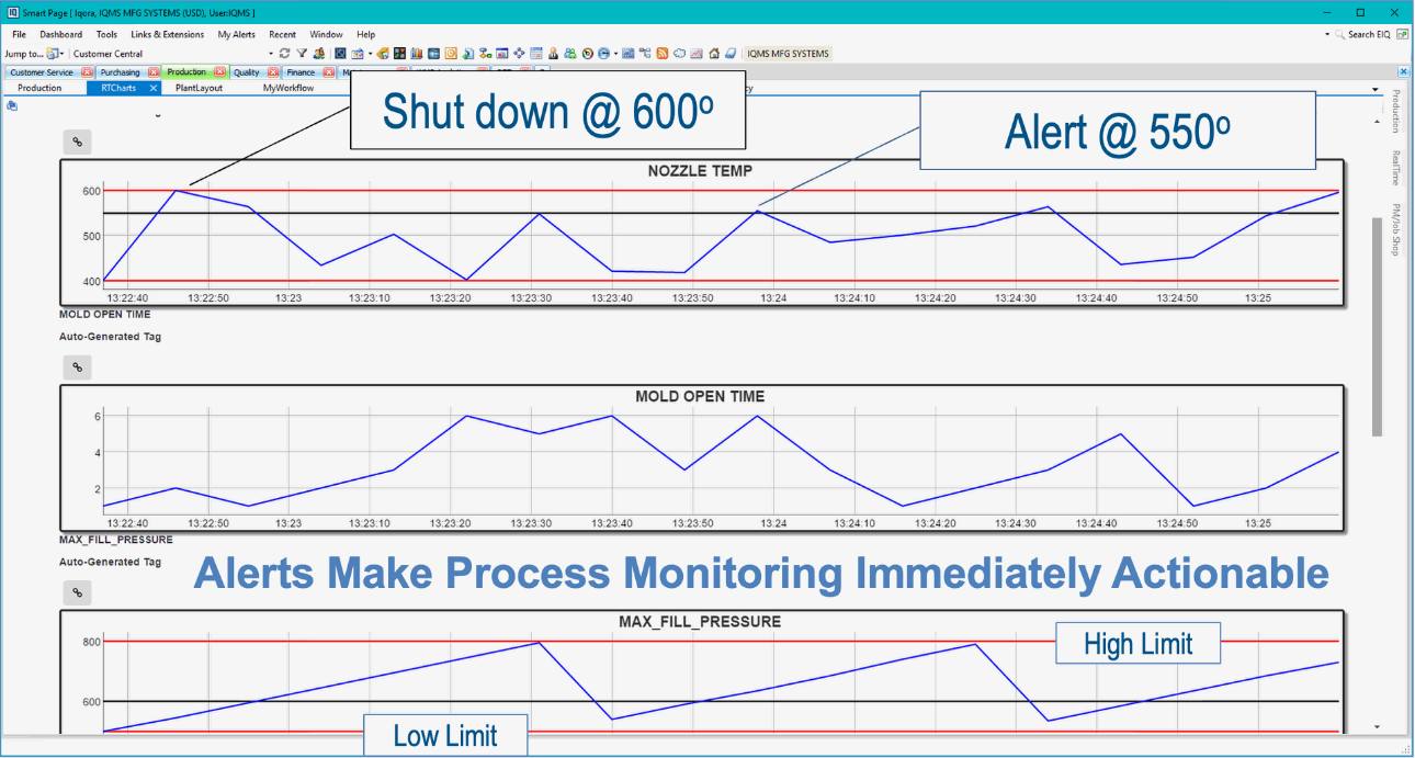 U praksi, tipičan scenario je da za ključne artikle ili alate (npr. kalupi za brizganje plastike, progresivne alatke za presovanje, ekstruderi) inženjer kvaliteta u Inspection Setup‑u napravi RealTime Inspection grupu sa procesnim parametrima koje želi da prati, označi ih kao RealTime parametre i poveže sa konkretnim radnim centrom ili procesom. Tokom rada, RealTime Process Monitoring preuzima vrednosti sa senzora (ili integrisanih gage‑eva), upisuje ih u SPC i automatski označava parametre bojama: zeleno za unutar tolerancije, crveno za van specifikacije, plavo za izračunate vrednosti, uz mogućnost run-rules analize (trend, serija na jednoj strani srednje linije, nagle promene, itd.). Ovakav pristup omogućava fabričkim timovima da ne čekaju na krajnju dimenzionu kontrolu, već da vide kada proces “izlazi iz koloseka” i da intervenišu pre nego što dođe do škarta ili reklamacije.