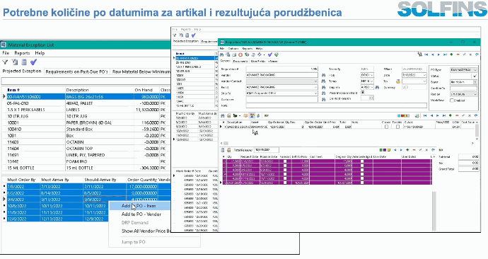 Iz perspektive planera i nabavke, proces u DelmiaWorks‑u kreće od MRP/Materials Exceptions liste, gde sistem na osnovu Sales Orders, forecasta, BOM‑ova, lead time‑ova i trenutnih zaliha detektuje gde nedostaje materijal ili usluga. Iz te liste kupac (buyer) može jednim klikom da generiše Purchase Requisition, sa predloženim artiklom, količinom i traženim datumom isporuke, uz povlačenje default podataka o dobavljaču, uslovima plaćanja i FOB iz Vendor mastera. Nakon odobrenja requisition‑a, sistem ga automatski konvertuje u Purchase Order sa svim stavkama, količinama i Promise/Requested datumima, pri čemu jedan PO može imati više artikala i više release datuma po artiklu.