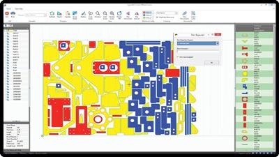 Operater na CNC mašini vidi grafički prikaz krojne liste (nestinga) sa delovima u bojama, prema unapred definisanim kriterijumima.