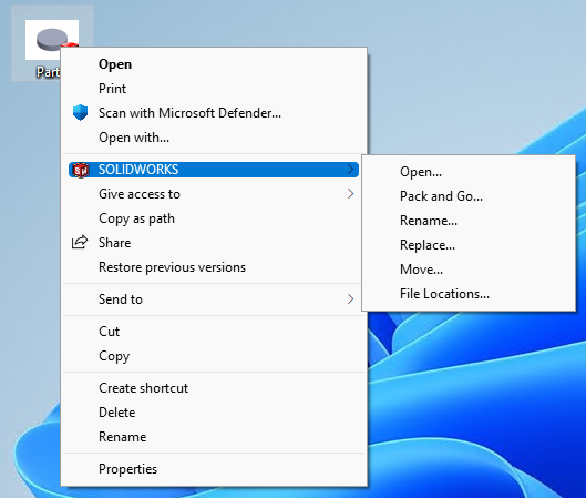 U Windows 11 okruženju kliknuti na bilo koji SolidWorks fajl i ići desni klik. Nakon toga ići na opciju "Show more options". Nakon otvaranja dodatnih opcija, u padajućem meniju bi trebalo biti vidljivo polje SolidWorks, kao na slici.