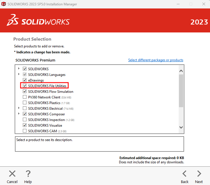 Ukoliko SolidWorks File Utilities nije vidljiv pomoću koraka 1, morate proveriti u Product Selection prozoru samog Installation Manager-a, da li je SolidWorks File Utilities štikliran.