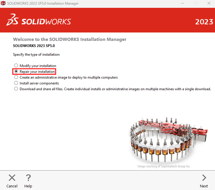 Uraditi Repair instalacije SolidWorks-a. Potrebno je izabrati sve proizvode kod kojih će se izvršiti Repair instalacija.