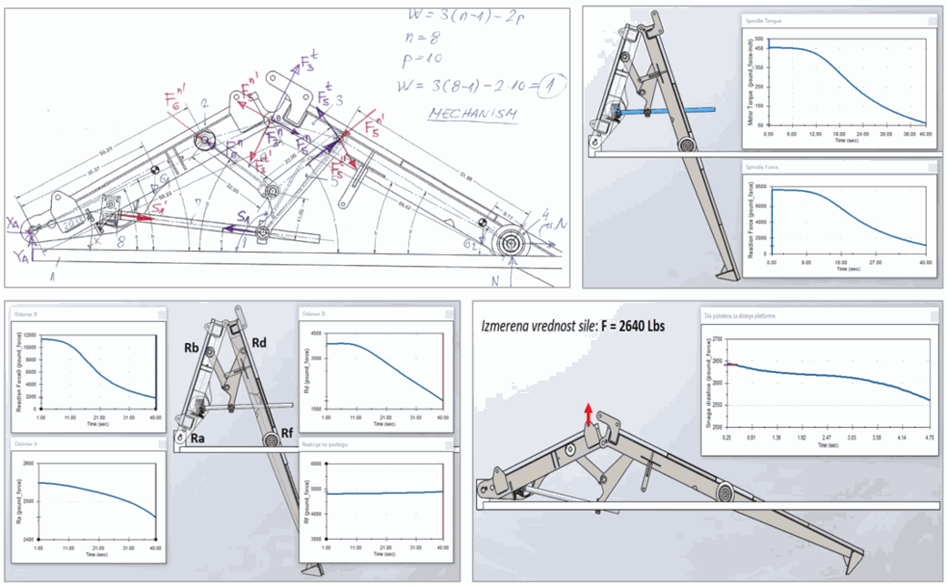 After sketching the basic concept, it is possible to check dimensions and working strokes, with calculations of the lever resistance and the sizing of the cylinders, engine and bearings.