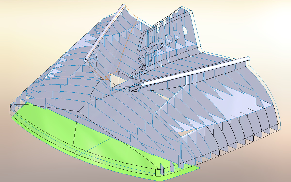 Koristeći površinski model trupa i zapreminske modele iz prethodnog koraka dolazimo do površinskog modela konstrukcije. Ovakav pristup omogućava kreiranje velikog broja rebara i pregrada odjednom, čime se postiže znatno veća produktivnost u odnosu na „element po element“ pristup, prema kome se svako rebro i njegovi elementi tretiraju posebno.