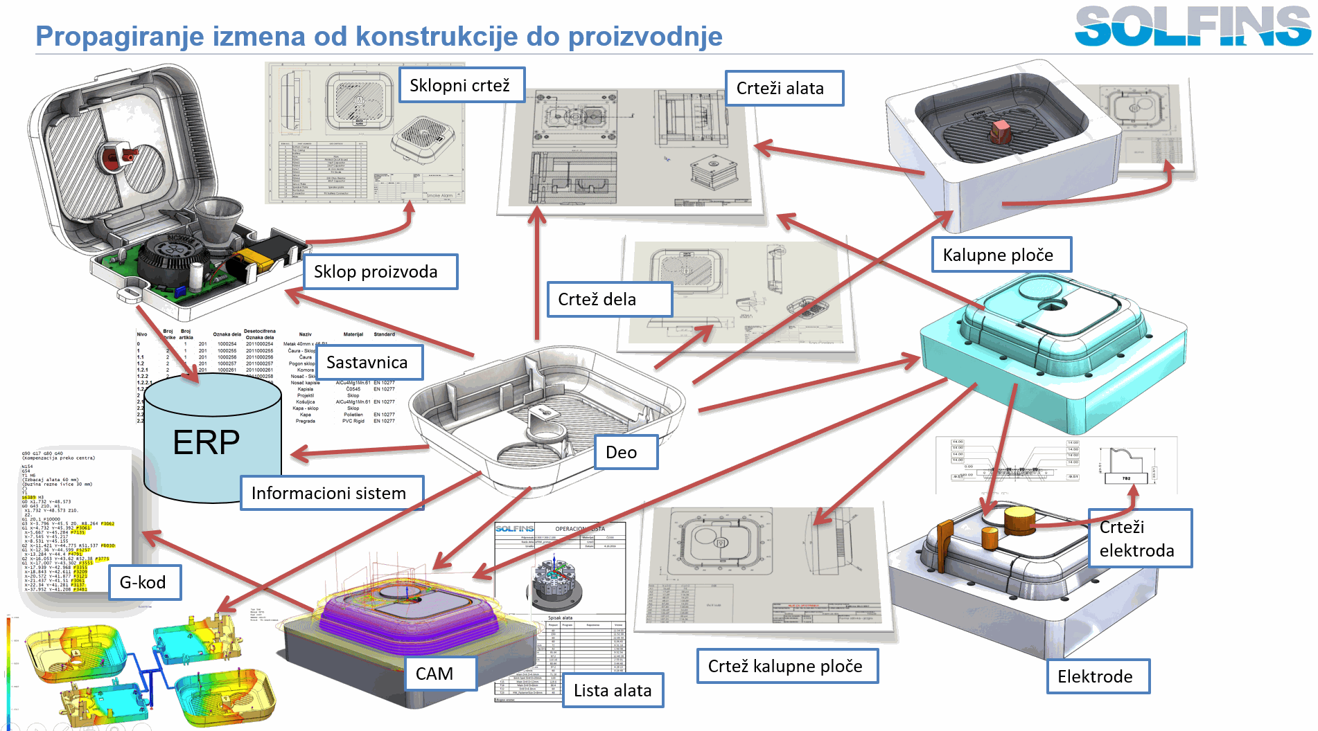 3D CAD softver mora da prati taj proces i tu industriju i upravo je firma Solfins napravila kompletnu bazu komponenti i metodologiju rada za najefikasniju konstrukciju alata. Baza svih komponenti i kućišta se nalazi centralizovano u PDM softveru i dostupna je svim konstruktorima. Sve ploče i komponente u sebi sadrže potrebnu geometriju i šifre za poručivanje od dobavljača.
