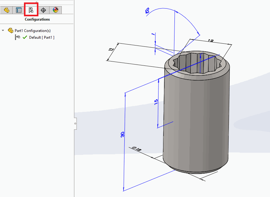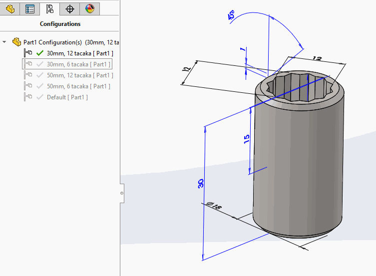 Biranje i kreiranje konfiguracija se vrši na posebnom tabu ( slika desno). Svaki model koji se kreira ima jednu Default konfiguraciju, a u nastavku će na primeru gedore biti kreirane 4 nove konfiguracije. Svakoj će se dodeliti odgovarajući naziv radi olakšane promene pri kasnijoj upotrebi dela na sklopu ili crtežu.