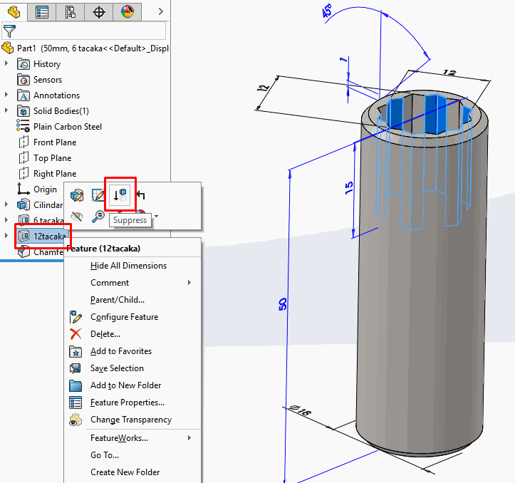 Nakon izmena dimenzija, trebalo bi ukloniti otvor koji kreira otvor sa 12 tacaka. Ukoliko se radi supressovanje kroz konfiguracije, softver uklanja selektovani feature samo u aktivnoj konfiguraciji. Ukoliko postoji potreba za supresovanje u više konfiguracija, trebalo bi koristiti alat Configure feature koji se pali kada idemo desni klik na željeni feature.